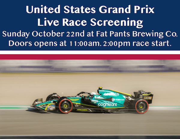 Formula 1 is heading to the Circuit of Americas for the US Grand Prix and we’re off to Fat Pants Brewing Co to catch the race live. Join us to enjoy brunch, a brew or two, and hang with the local Twin Cities F1 crew. What: US Grand Prix Live Race Screening When: Sunday, October 22nd –Continue reading “Join us Sunday, October 22nd, for the US Grand Prix”