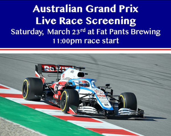 Formula 1 is heading to Albert Park in Melbourne for the Australian Grand Prix and off returning to Fat Pants Brewing Co. to catch the race live. Come join us to catch the race , grab a brew, and hang out with the local F1 enthusiast crew. What: Australian Grand Prix Live Race Screening When:Continue reading “Join us Saturday, March 23rd, for the Australian Grand Prix”