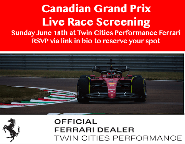 Twin Cities Performance Ferrari is welcoming us back to their beautiful dealership for a live screening of the Canadian Grand Prix on June 18th. Space is limited, so be sure to RSVP now via the link below to reserve your spot. RSVP: https://www.eventbrite.com/e/canadian-grand-prix-viewing-party-tickets-640695586747